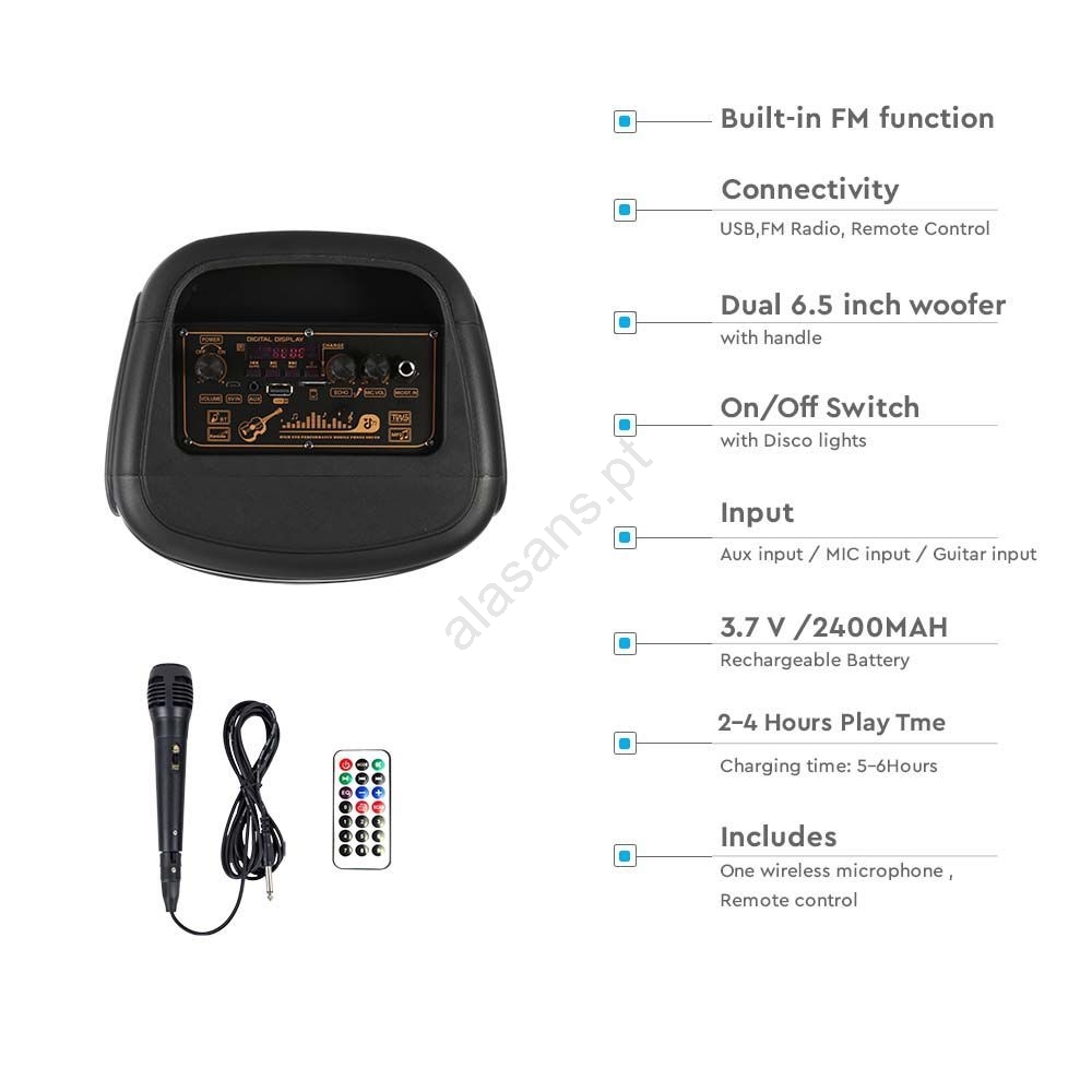 • Este alto-falante portátil de 400W oferece um som rico e impressionante.