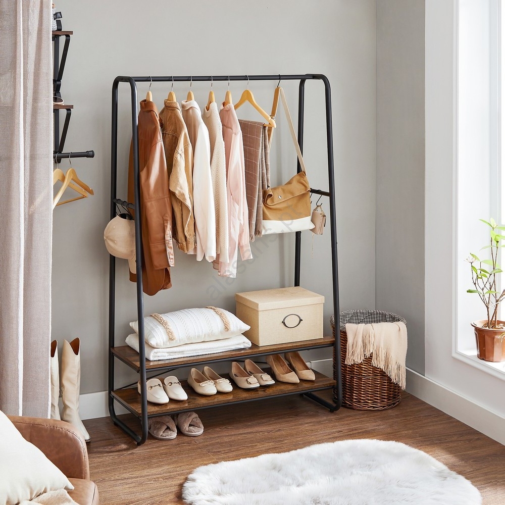 • Pendure casacos, camisas e calças na barra superior ao longo de todo o comprimento, coloque malas, sapatos ou caixas nas 2 prateleiras de arrumação e pendure chapéus, cachecóis e guarda-chuvas nas laterais.