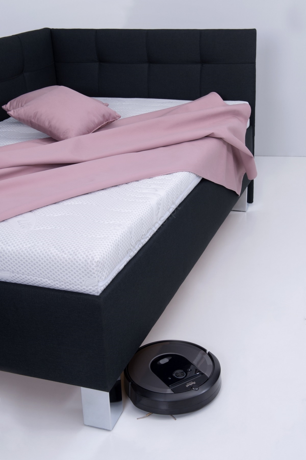 • Pés estáveis e de design trabalhado, com 15 cm de altura em acabamento cromado, não só realçam o aspeto moderno da cama, como permitem uma limpeza fácil, inclusive com um aspirador robô.