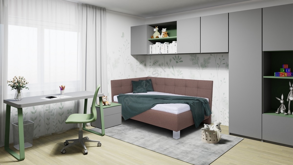 • Cama estofada MARIA PETITE 120x200 cm com colchão e arrumação integrada, cinzenta