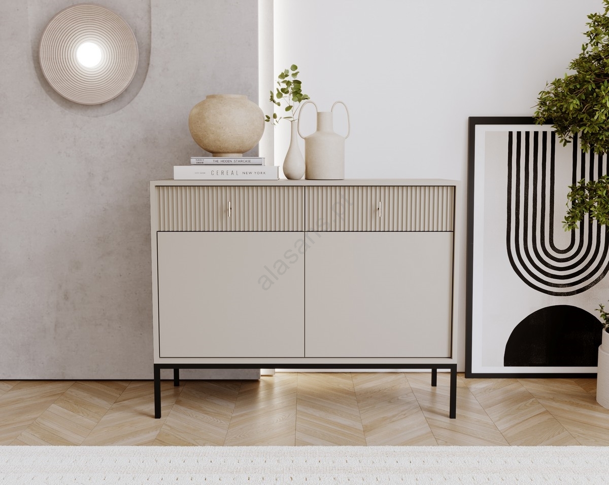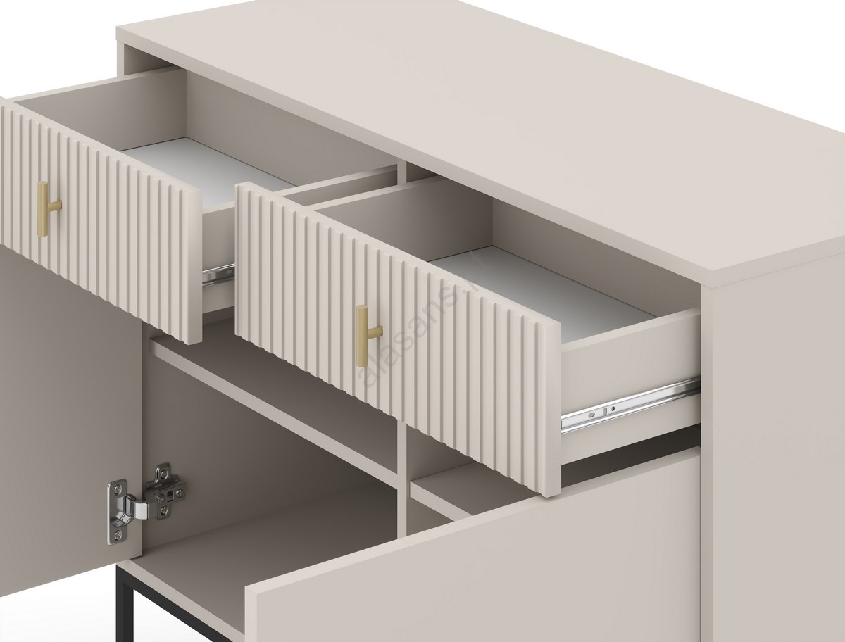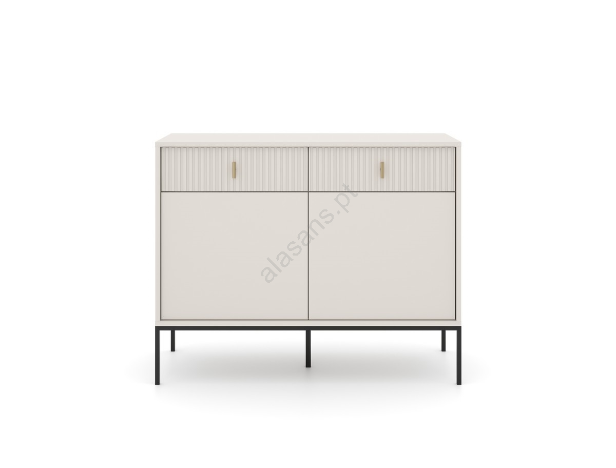 • Possui duas portas inferiores com amplo espaço de arrumação e duas gavetas com puxadores e frisos verticais.