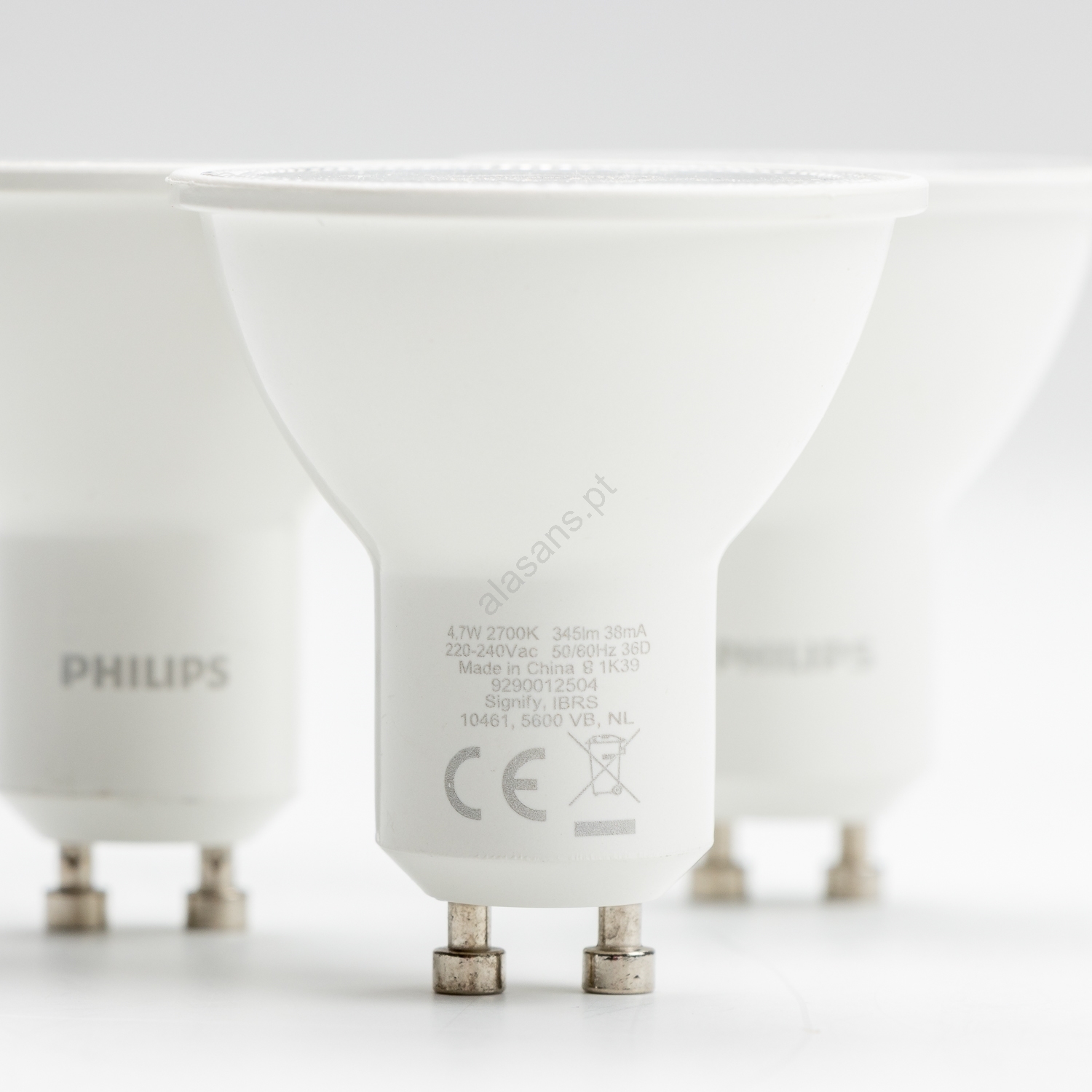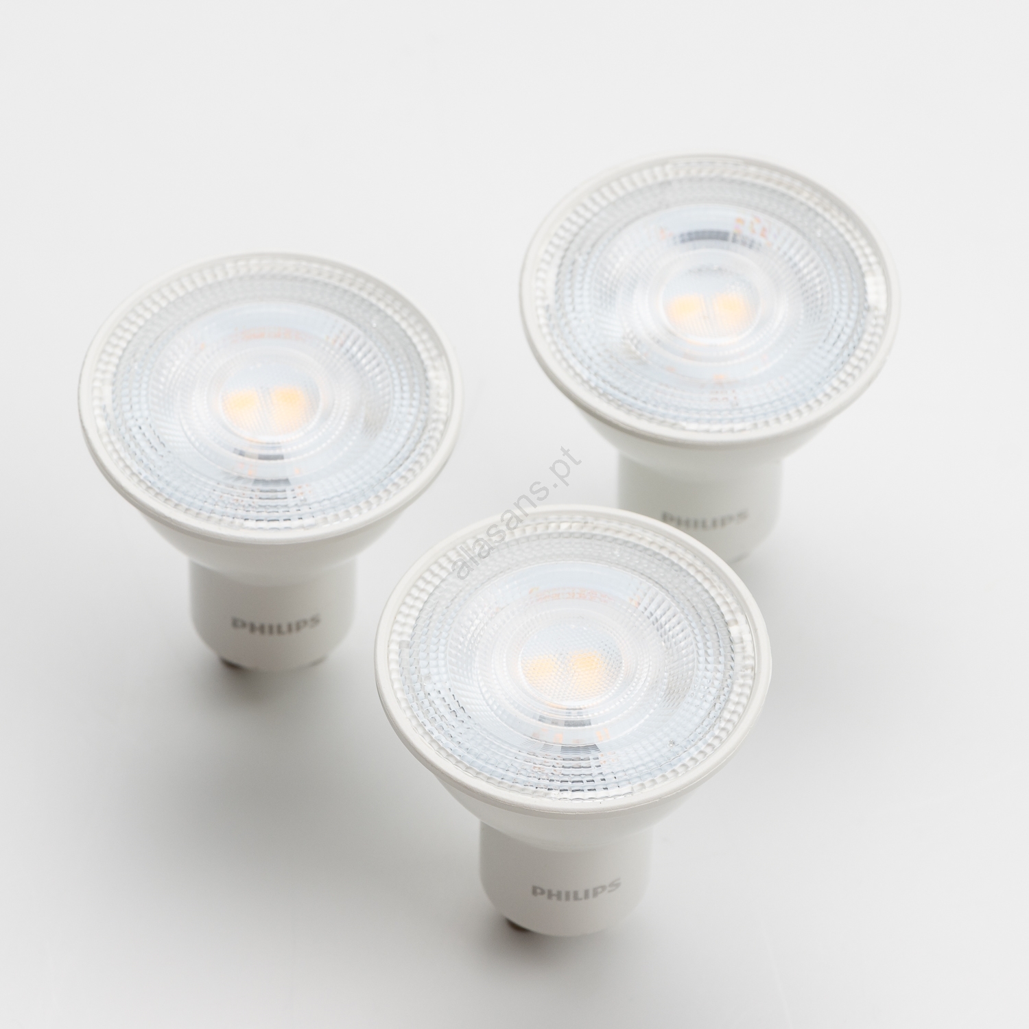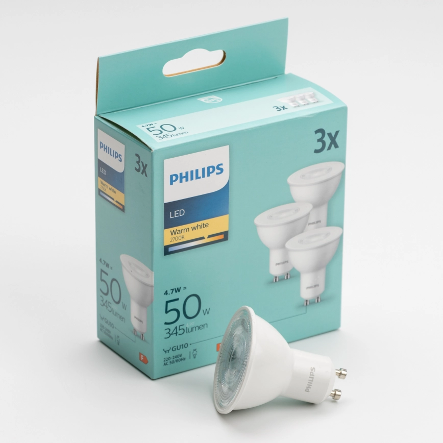 CONJUNTO 3x Lâmpadas LED Philips GU10/4,7W/230V 2700K O design de alta qualidade garante uma iluminação perfeita do seu interior. A categoria GU10 é dedicada às lâmpadas com o mesmo casquilho. Na nossa loja virtual, pode escolher entre lâmpadas com filamento tradicional ou lâmpadas LED modernas, que são mais eficientes em termos energéticos e têm uma vida útil mais longa.