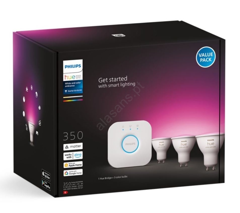 • O conjunto inclui o dispositivo de conexão Hue Bridge e 3 lâmpadas LED RGB Philips Hue White And Color Ambience com soquete GU10.
