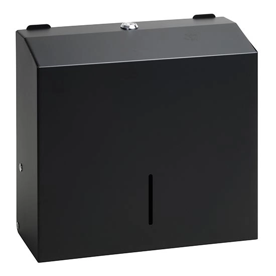 • Dispensador moderno preto de toalhas de papel que confere um aspeto elegante à casa de banho.
