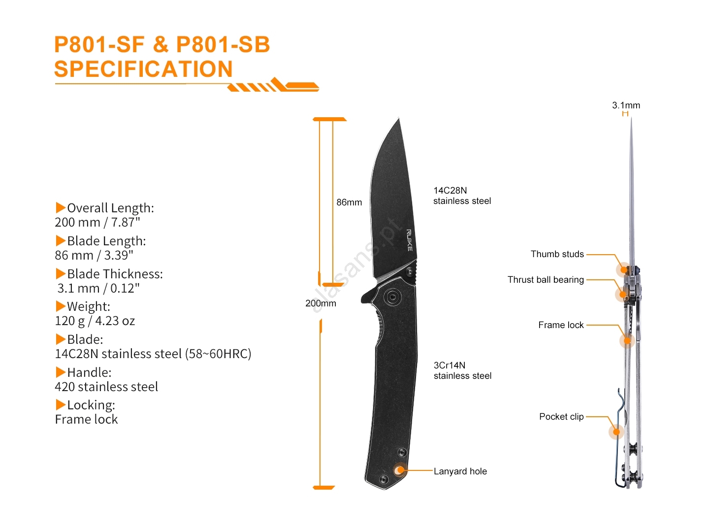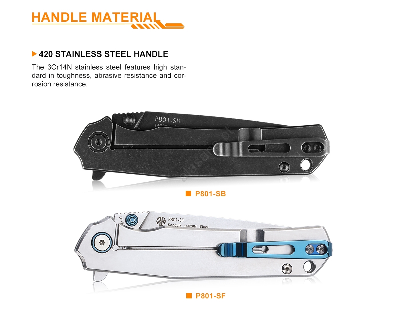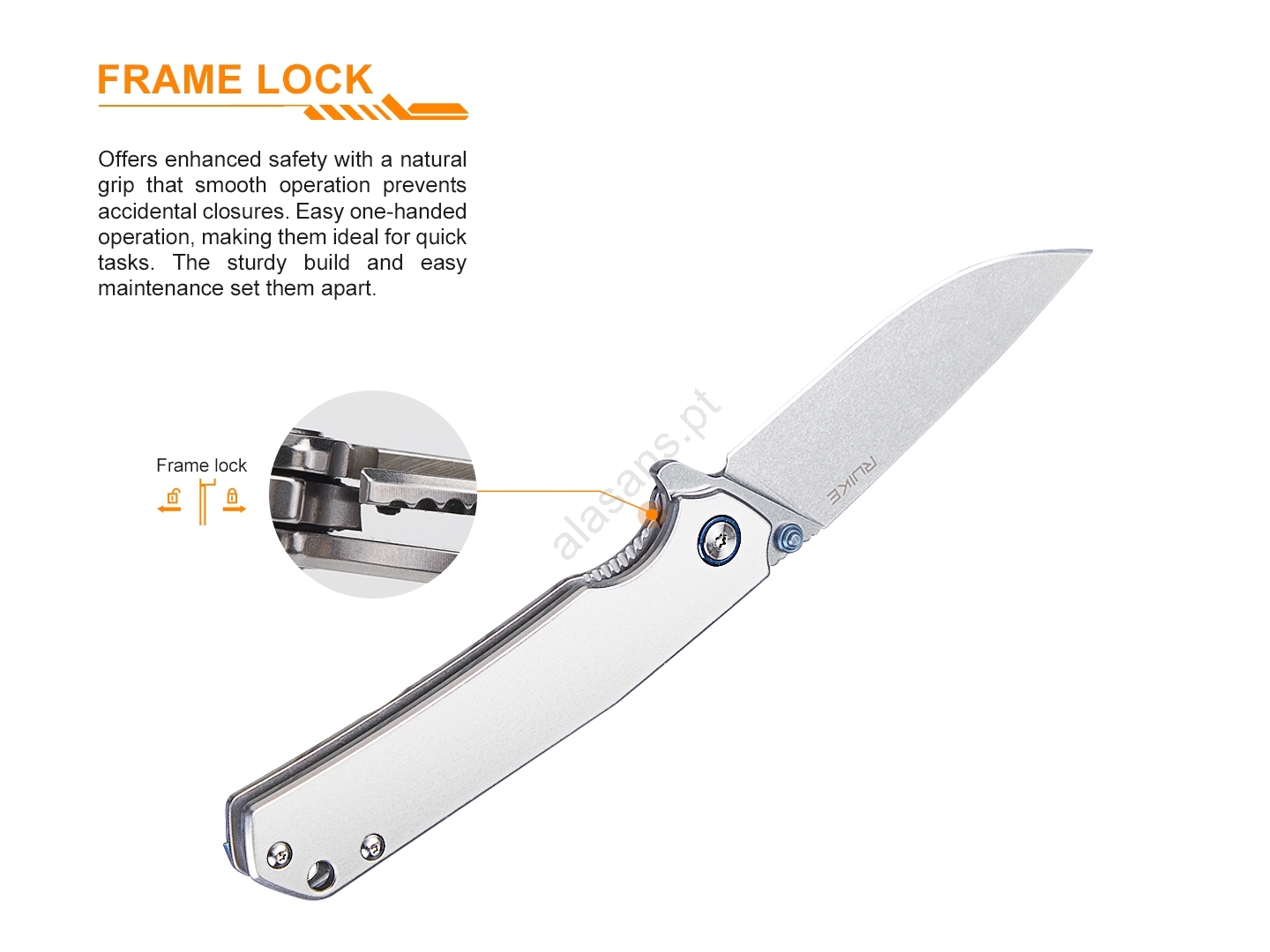• A faca de bolso dobrável Ruike 801-SF possui cabo em aço inoxidável 3Cr14N com acabamento jateado e é equipada com alavanca flipper para abertura rápida e confortável.