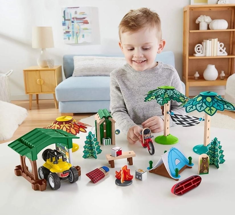 • Com o cenário, as crianças podem criar um destino de campismo de sonho, completo com árvores sombreadas, uma rede aconchegante, um passeio de canoa, uma fogueira de campismo para assar e muito mais.