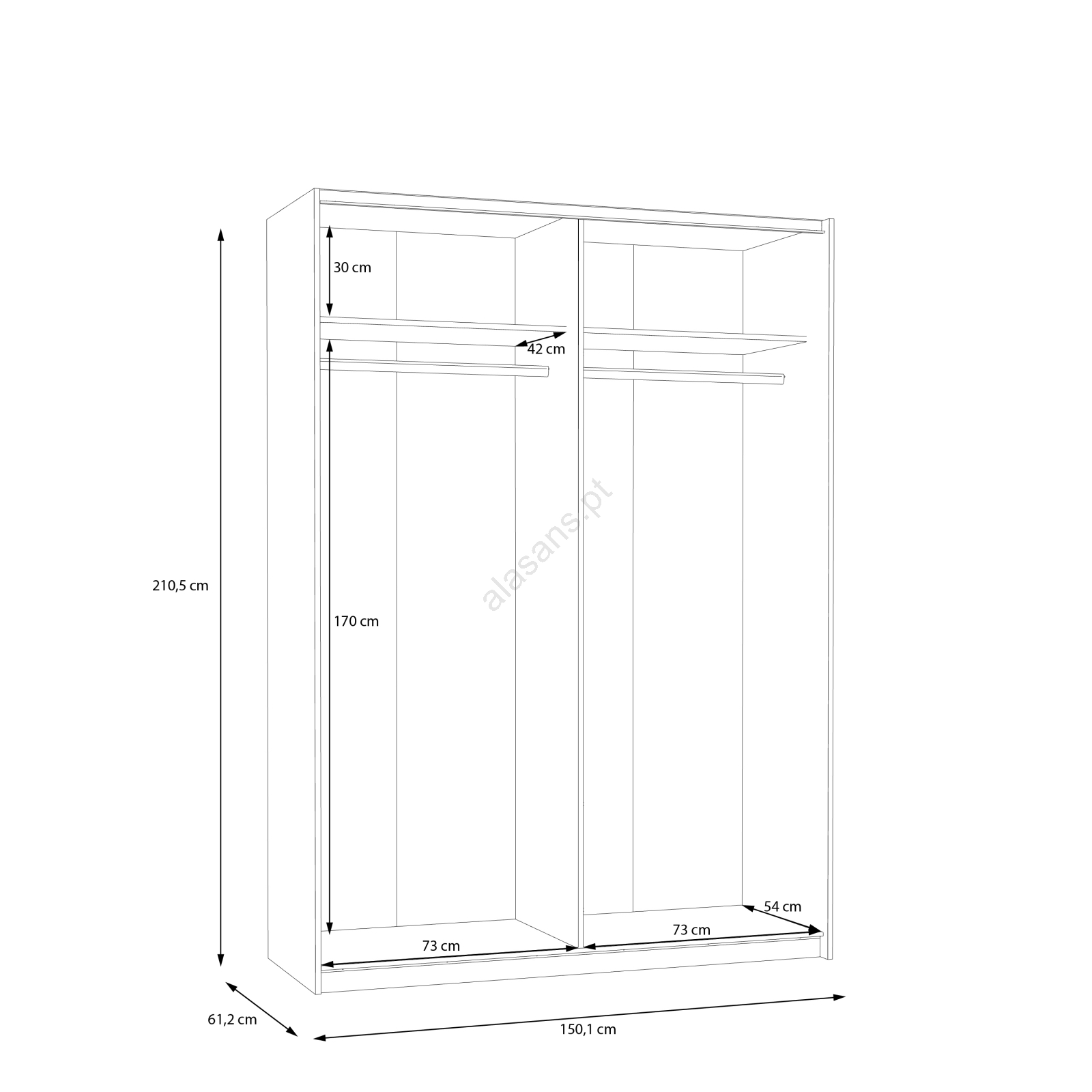 • O roupeiro dispõe de varões para pendurar, prateleiras e amplo espaço de arrumação para as suas roupas, malas e artigos sazonais.