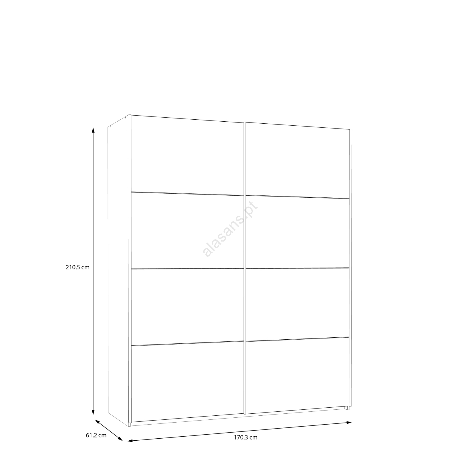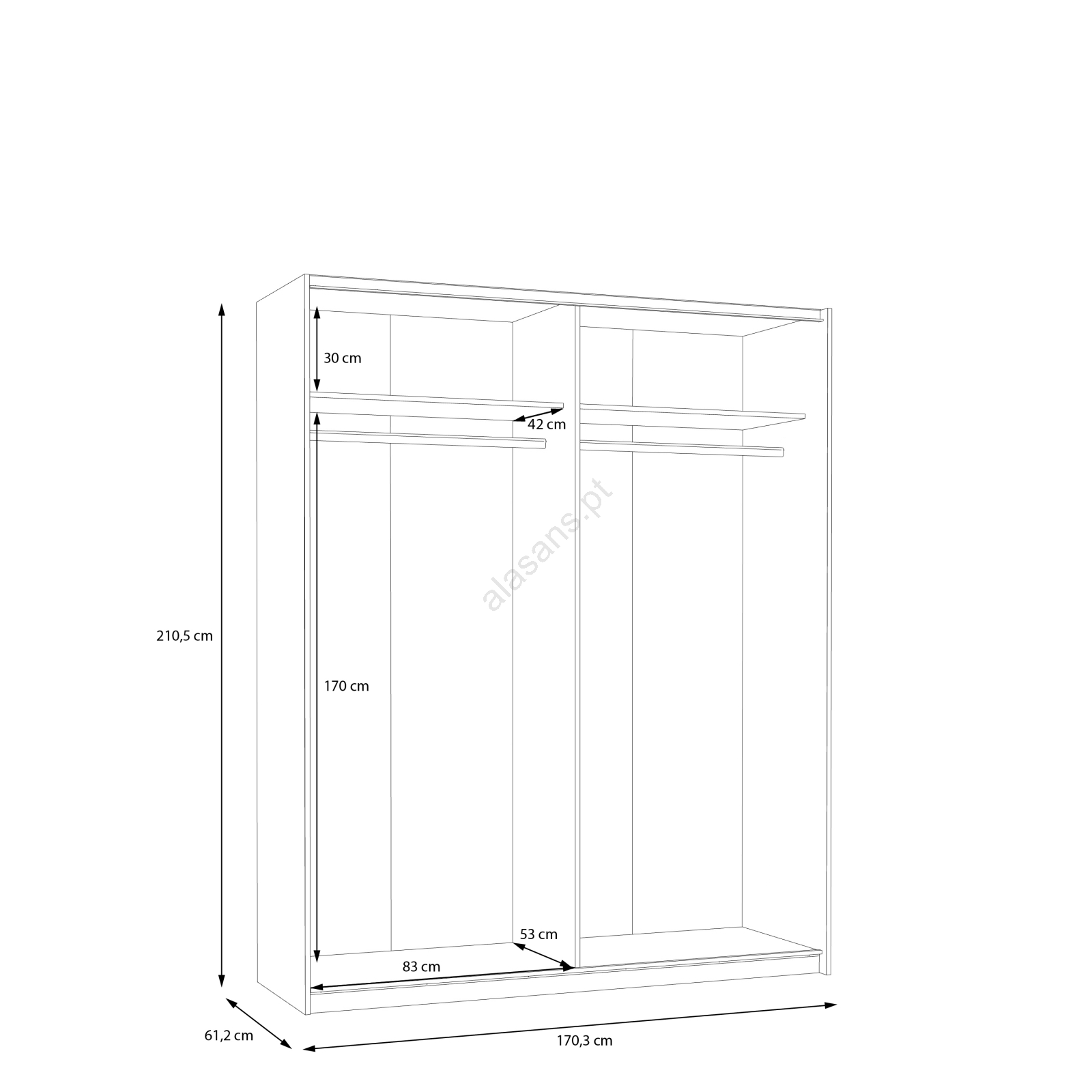 • O guarda-roupa dispõe de varões para cabides, prateleiras e amplo espaço de arrumação para as suas roupas, malas e artigos sazonais.