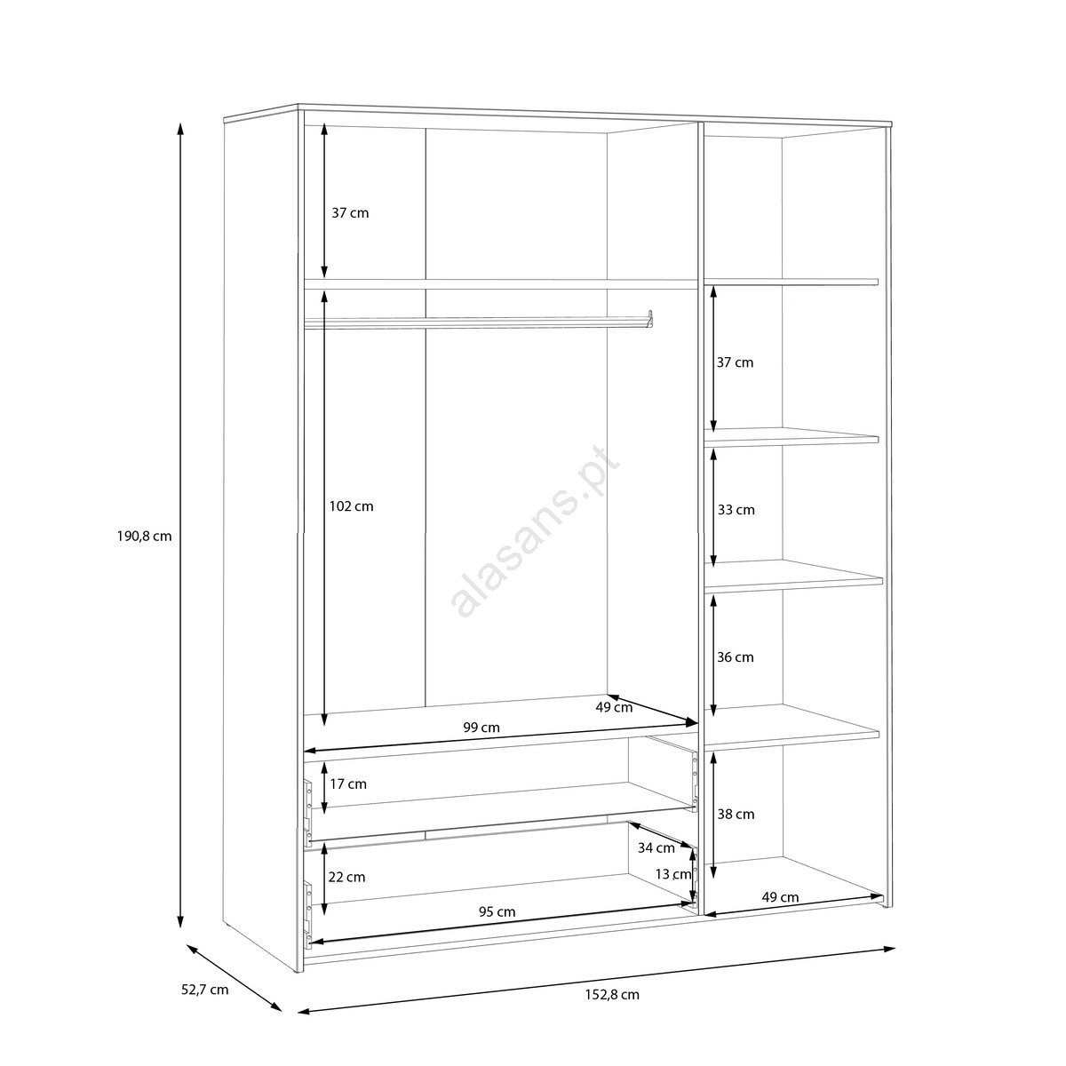 • O guarda-roupa inclui barra para cabides, prateleiras, gavetas e um amplo espaço de armazenamento para as suas roupas, bolsas e artigos sazonais.