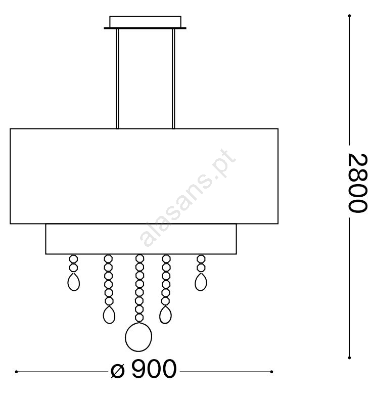 • A base metálica é complementada com dois abajures de pvc, que são inseridos um no outro. Os abajures são decorados com fios metálicos finos em cor branca e com pingentes de cristal cortados.