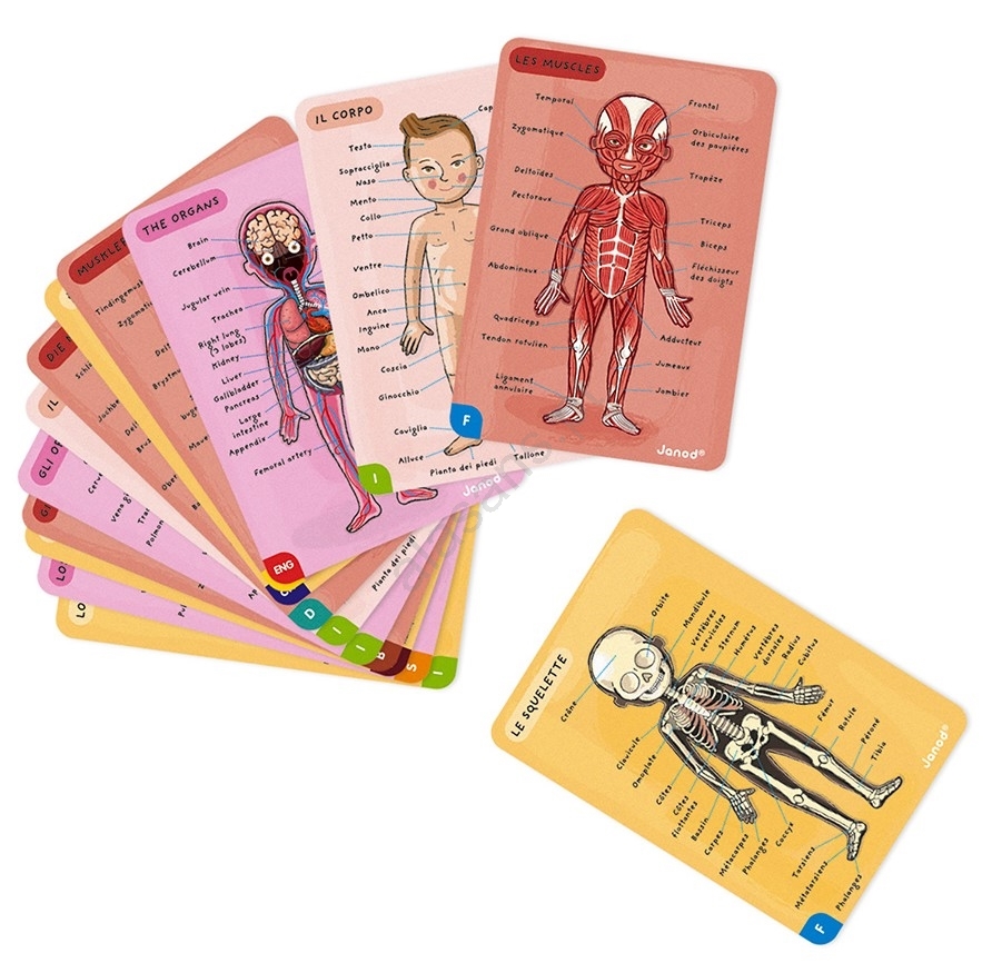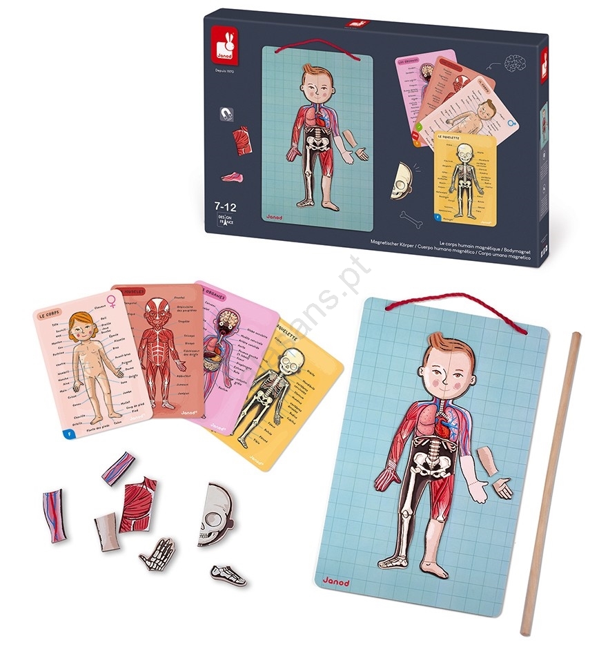 • O conjunto inclui: quadro magnético com anatomia do corpo humano, 76 peças magnéticas de papelão do corpo humano, apontador de madeira, 4 modelos em 11 idiomas.