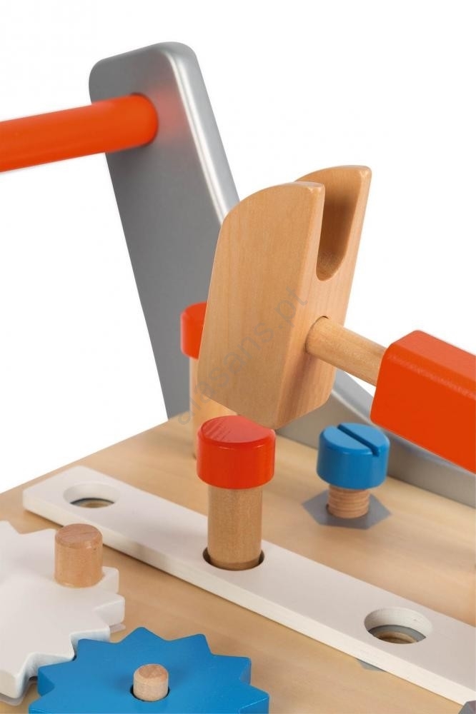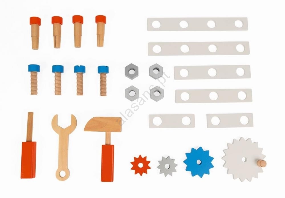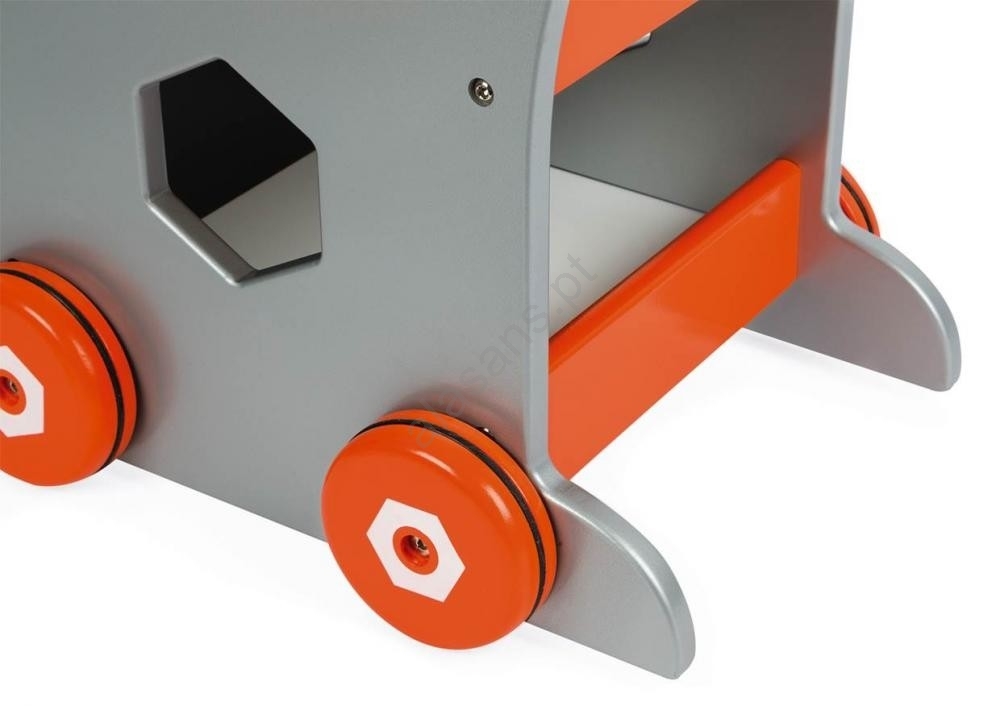 • O andador de madeira, que também funciona como carrinho com ferramentas, inclui: ferramentas magnéticas - martelo, chave de fenda e chave inglesa, 1 morsa, 4 engrenagens, 4 pregos, 4 parafusos, 4 porcas, 6 placas com furos.
