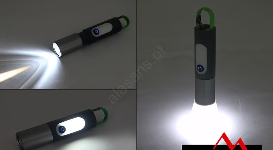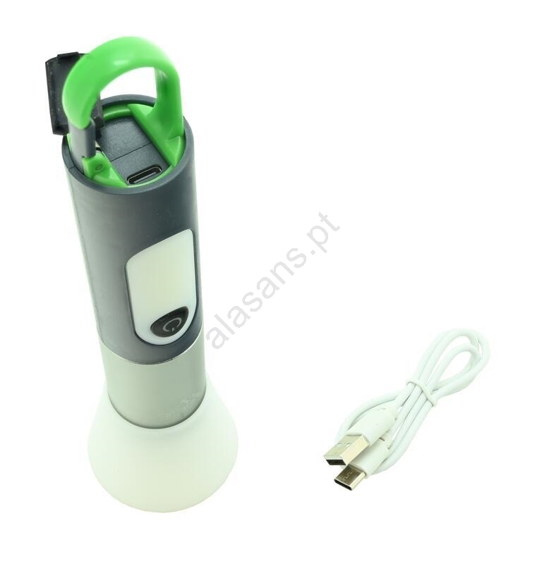 • A extremidade da lanterna possui uma entrada de carregamento protegida por tampa, e para facilitar o transporte, conta com um mosquetão.