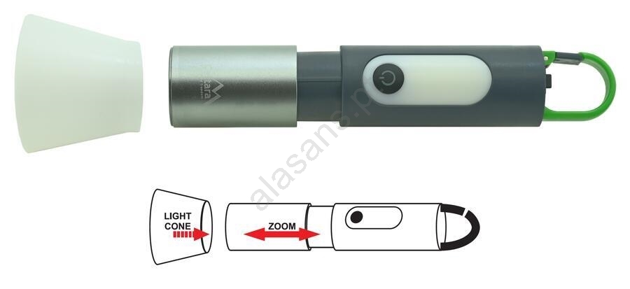 • Lanterna LED potente com cone de luz destacável e função ZOOM.