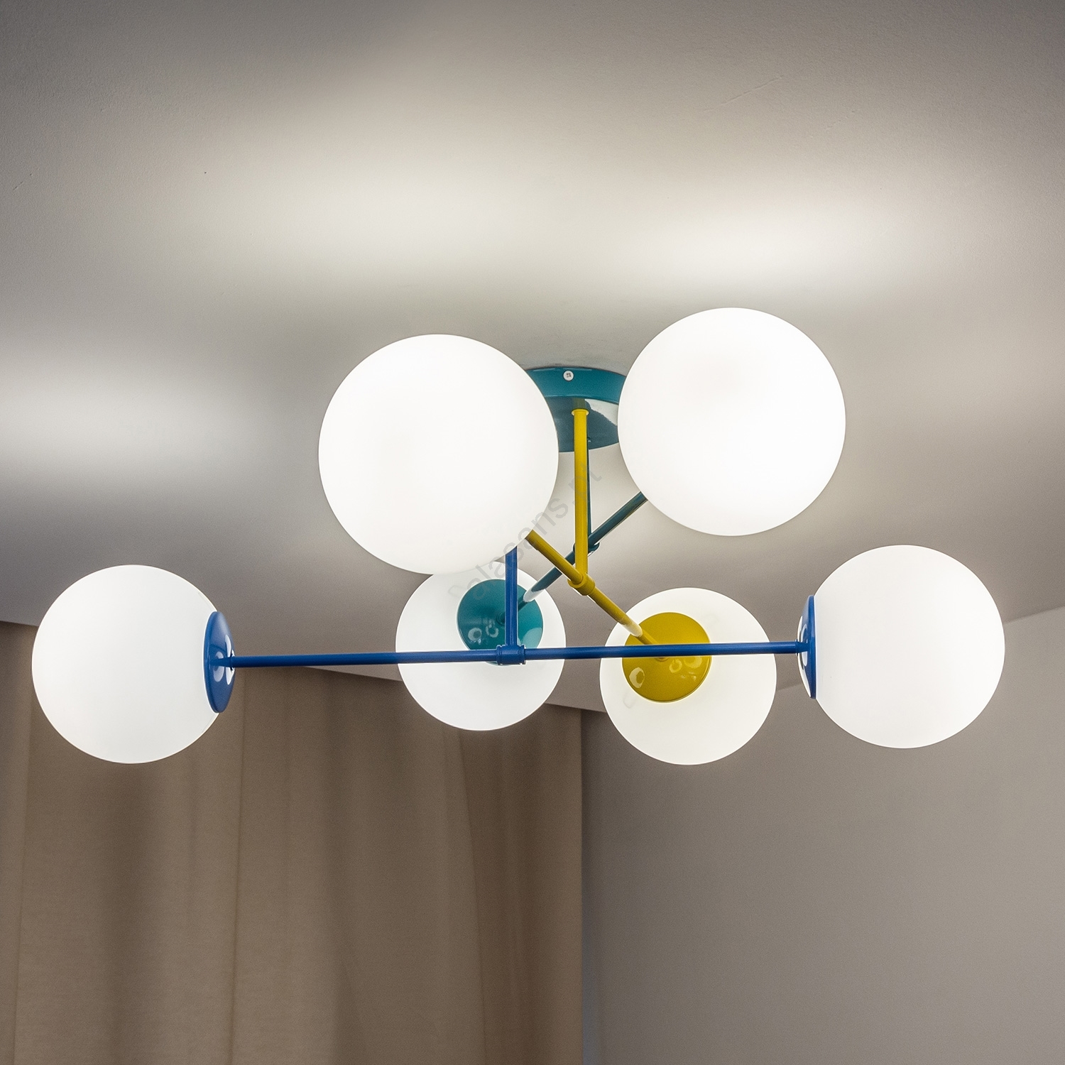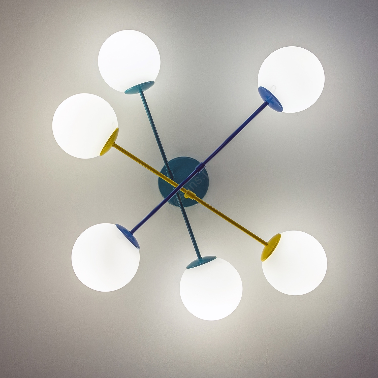 Lustre de montagem direta ao tecto MOON 6xE27/15W/230V turquesa/amarelo/azul caracteriza-se por um design agradável e funcional.  Uma lâmpada com casquilho E27 é adequada para a iluminação Aqui, pode comprar outras lâmpadas a preços vantajosos. Terá um complemento interessante para a sua casa.