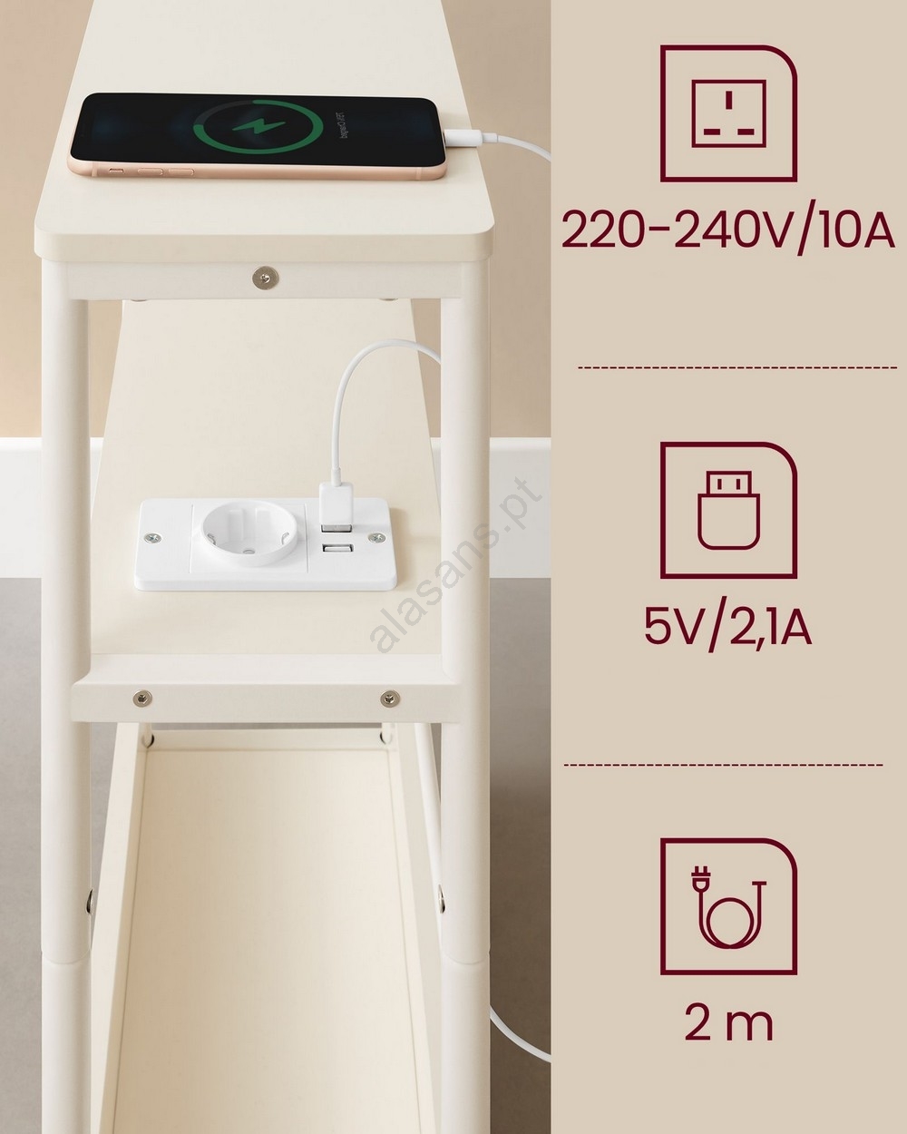 • Mesa de apoio com tomada elétrica integrada e portas USB ROD branca/creme