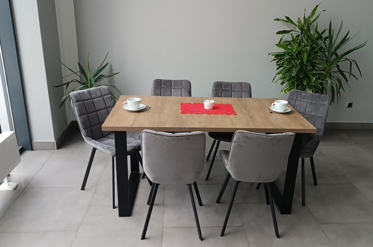 • O acabamento em carvalho confere à mesa de jantar um visual moderno e acolhedor.