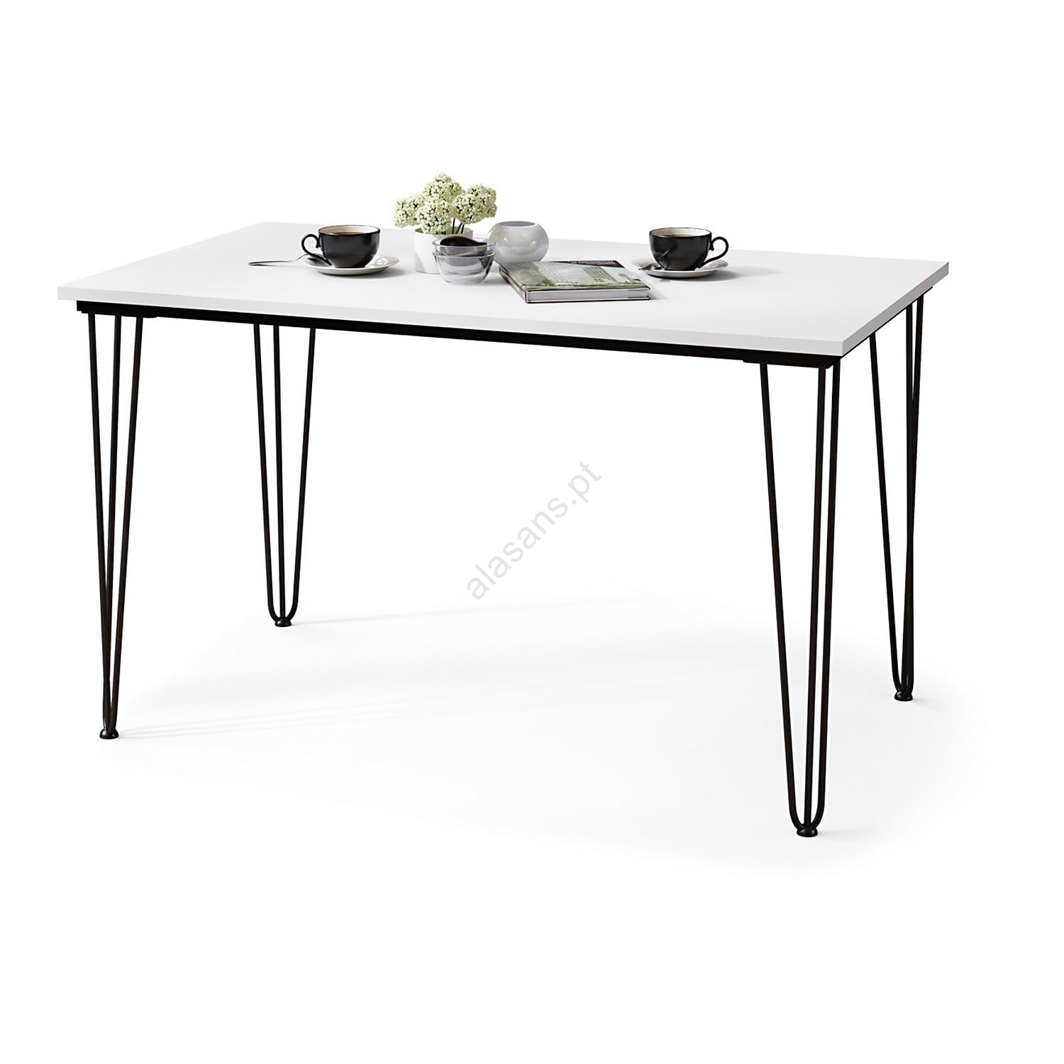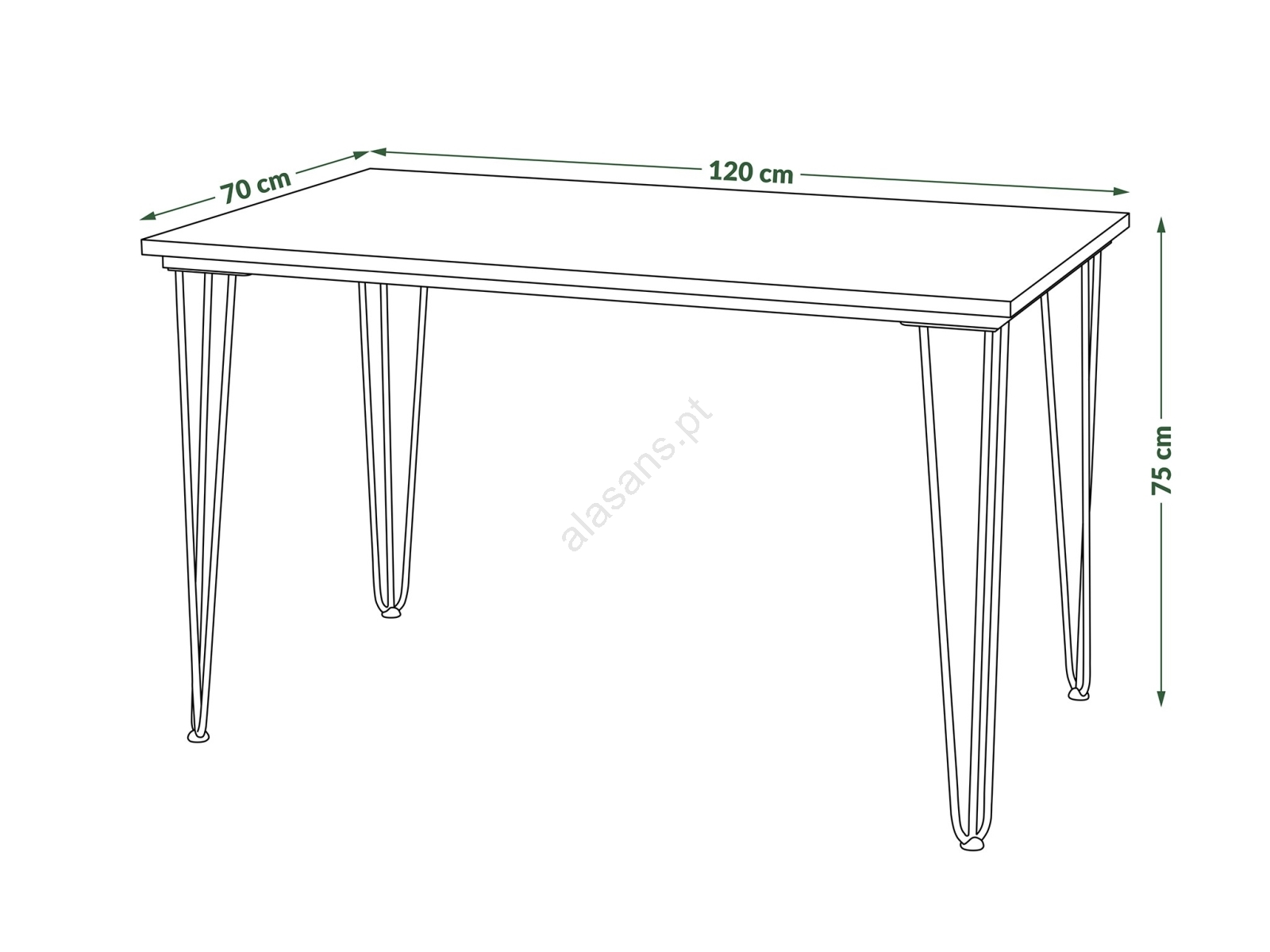 • A superfície da mesa, com dimensões de 120x70 cm, oferece espaço suficiente para refeições confortáveis ou trabalho.