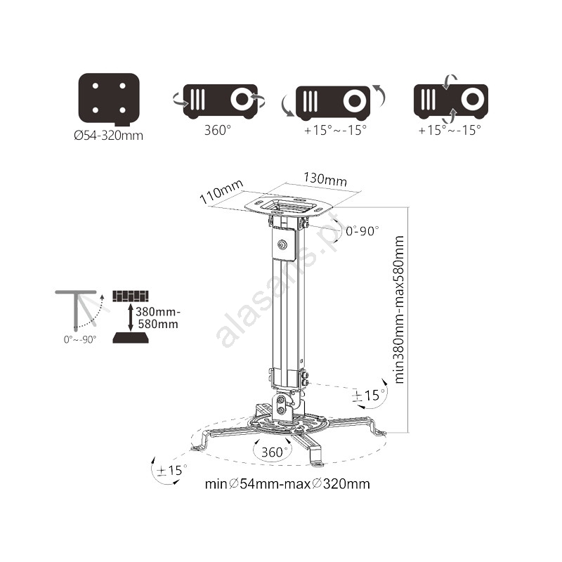 • Altura ajustável para uma projecção optimizada, de 380 a 580 mm a partir do tecto.