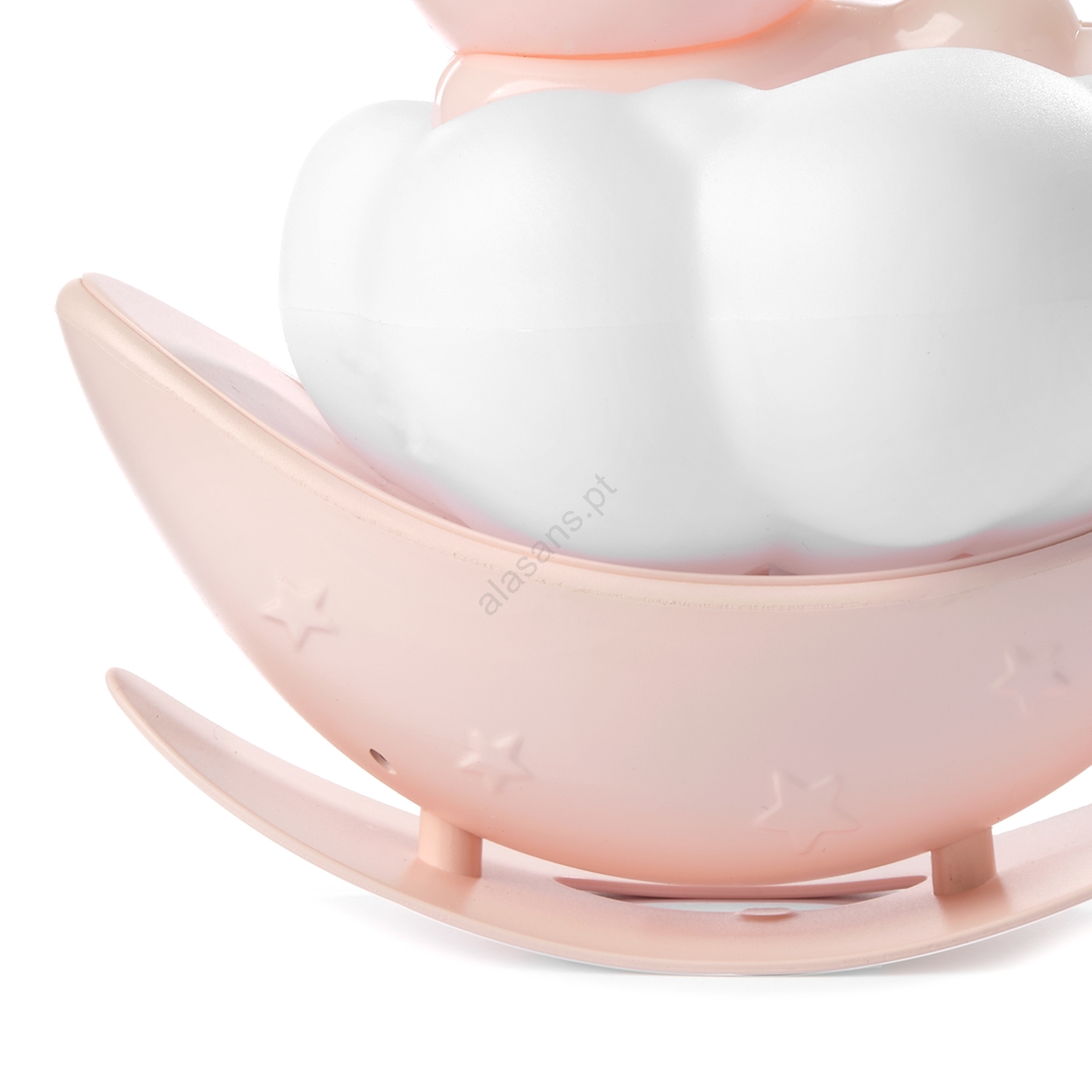• La Nuvolina Celeste Bunny é uma adorável luz noturna em forma de coelhinho rosa sentado numa nuvem branca.