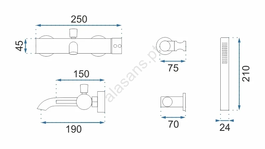 • Conjunto inclui: bateria para banheira, chuveiro de mão, mangueira de duche (190 mm), suporte para chuveiro de mão.