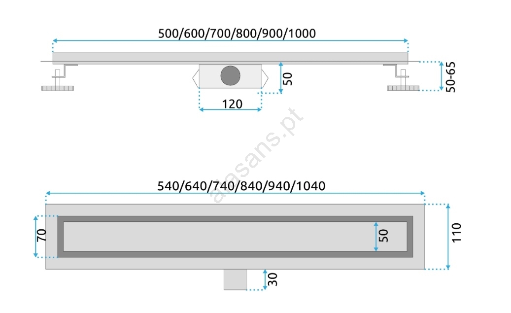 • Ralo linear de 60 cm com acabamento em tom inox.
