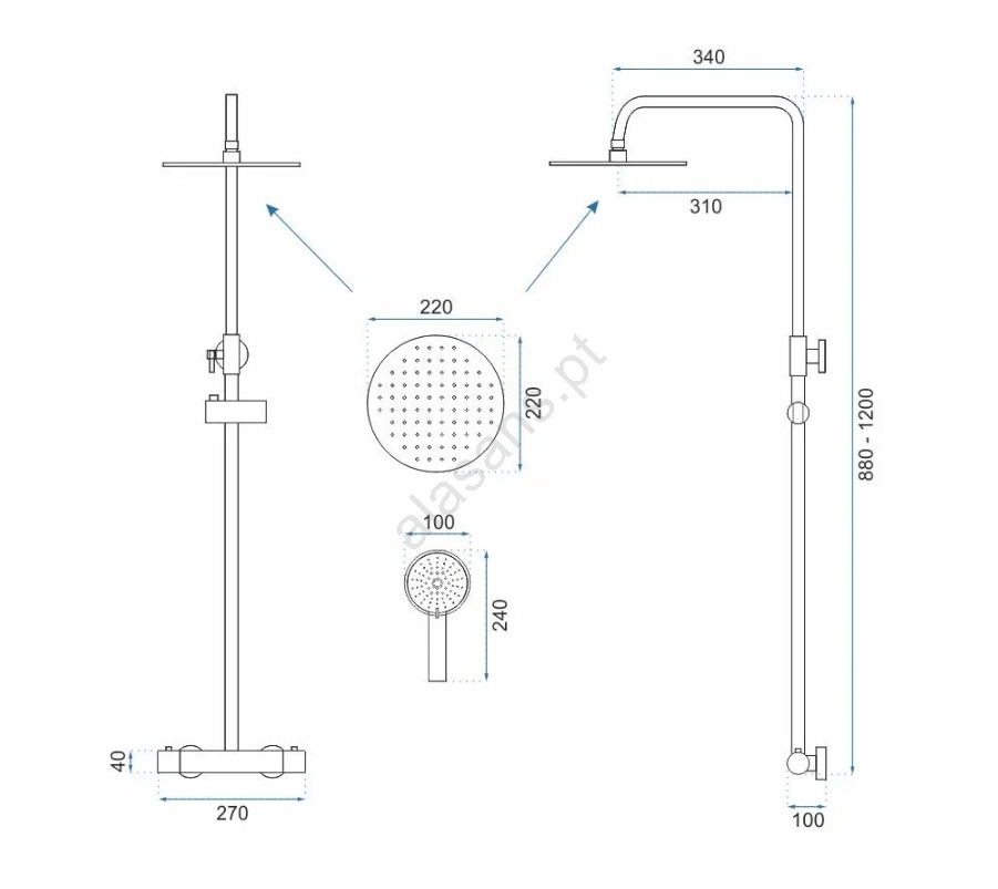 • A embalagem inclui: misturador termostático, duche de mão e cabeça de duche, suporte, mangueira de 150 cm.