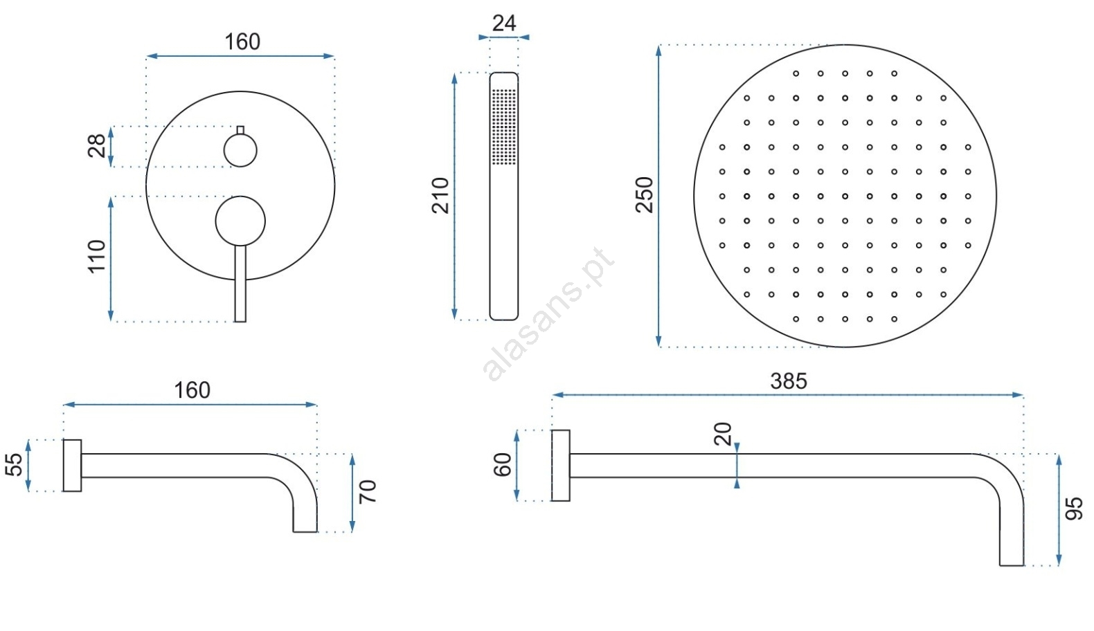 • Conteúdo da embalagem: caixa encastrada, misturador completo, braço, duche de mão e cabeça de duche, suporte para duche de mão, bica de saída, mangueira de 150 cm.