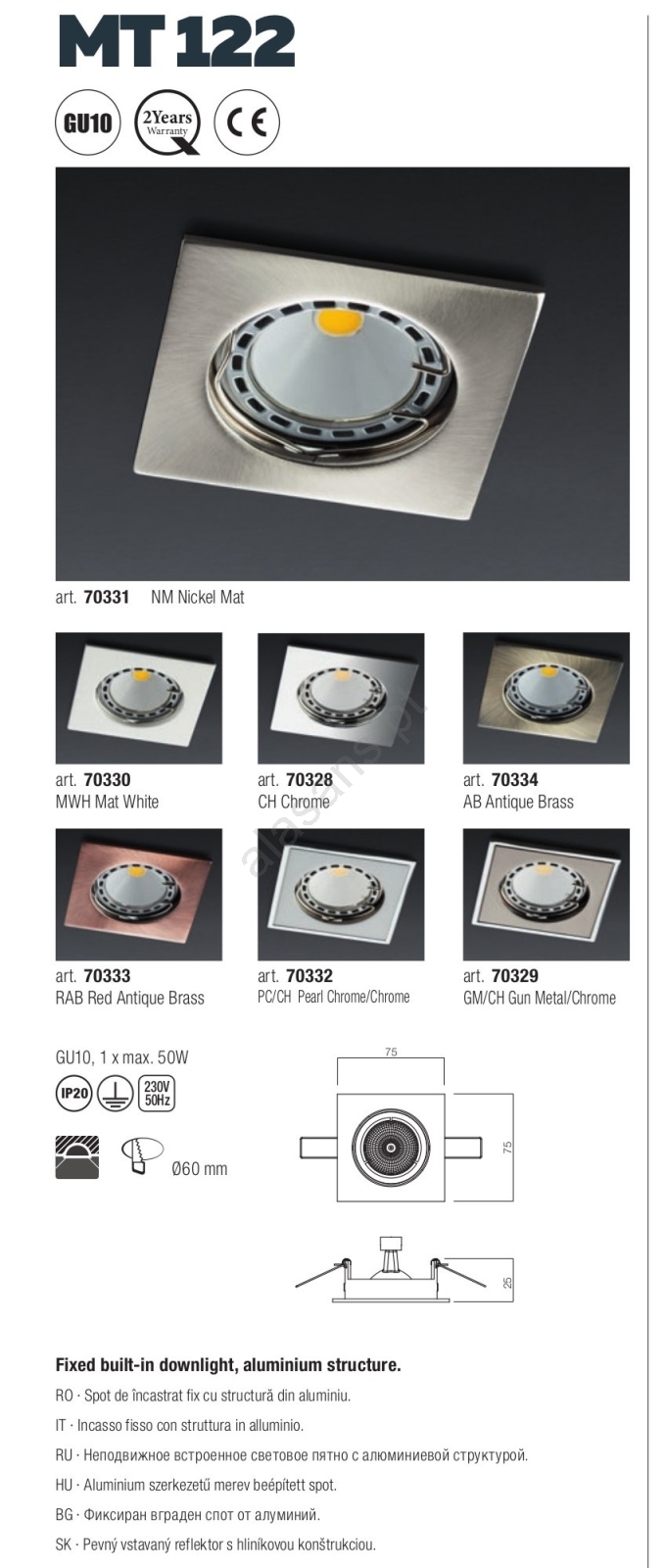 Redo 70328 - Foco de encastrar MT 1xGU10/50W/12V caracteriza-se por um design agradável e funcional.  Uma lâmpada com casquilho GU10 é adequada para a iluminação Aqui, pode comprar outras lâmpadas a preços vantajosos. Terá um complemento interessante para a sua casa.