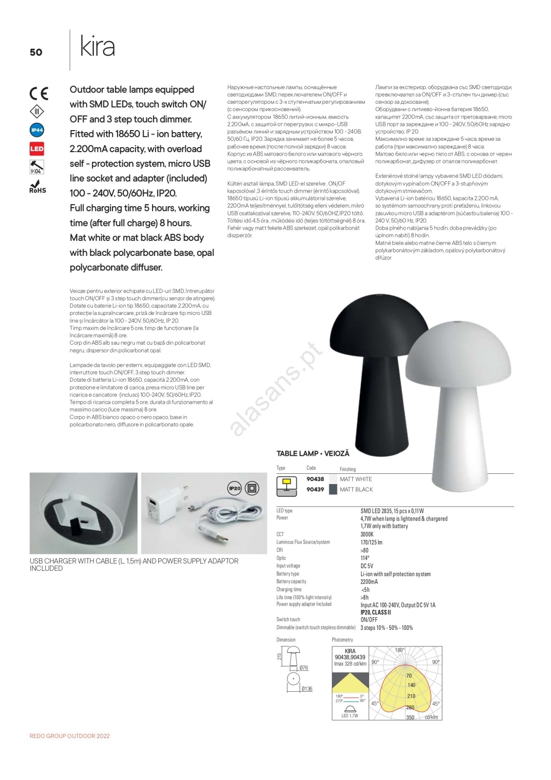 • Redo 90438 - Lâmpada LED exterior tátil regulável KIRA LED/4,7W/230V 2200 mAh IP44 branca
