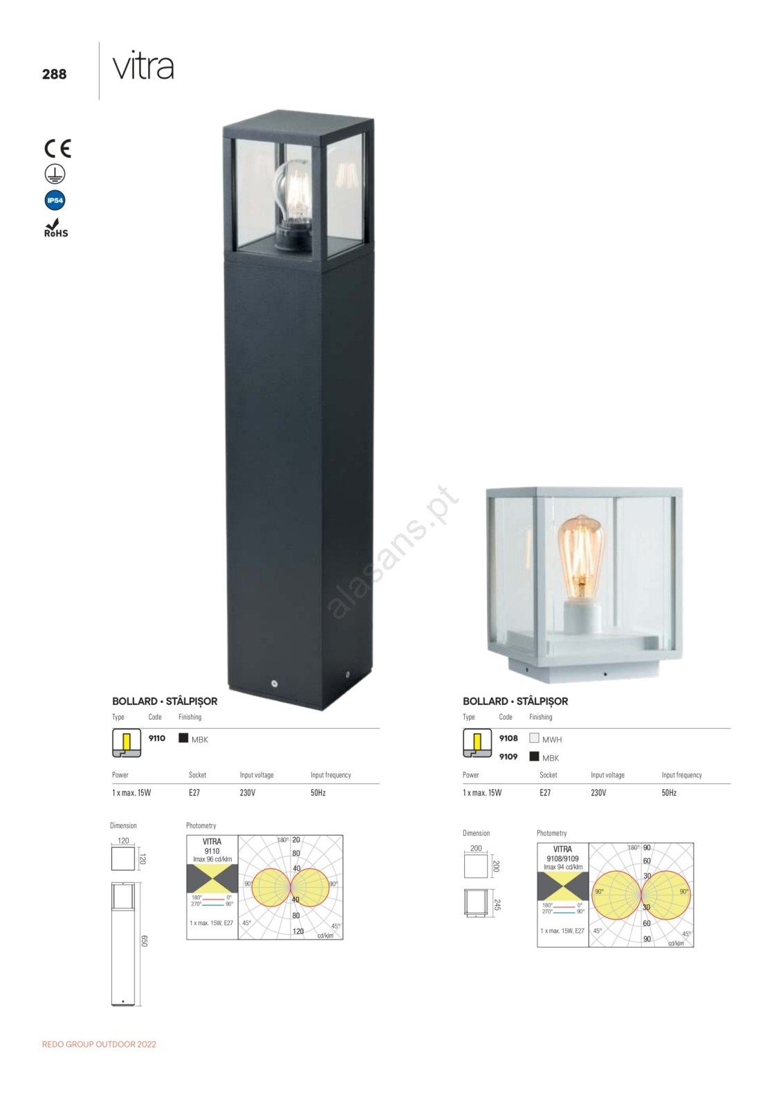 Redo 9109 - Candeeiro exterior VITRA 1xE27/15W/230V IP54 preto caracteriza-se por um design agradável e funcional.  Uma lâmpada com casquilho E27 é adequada para a iluminação Aqui, pode comprar outras lâmpadas a preços vantajosos. Terá um complemento interessante para a sua casa.