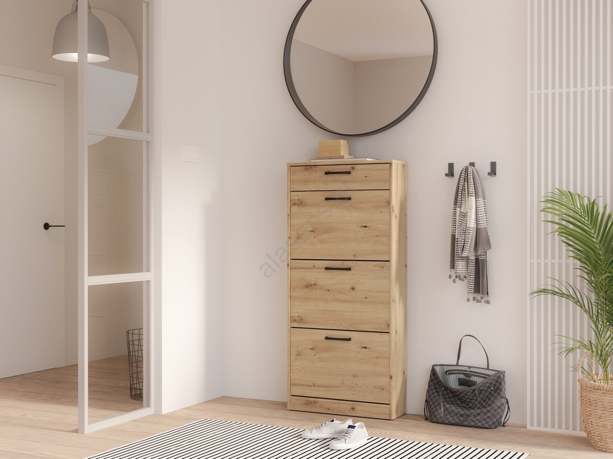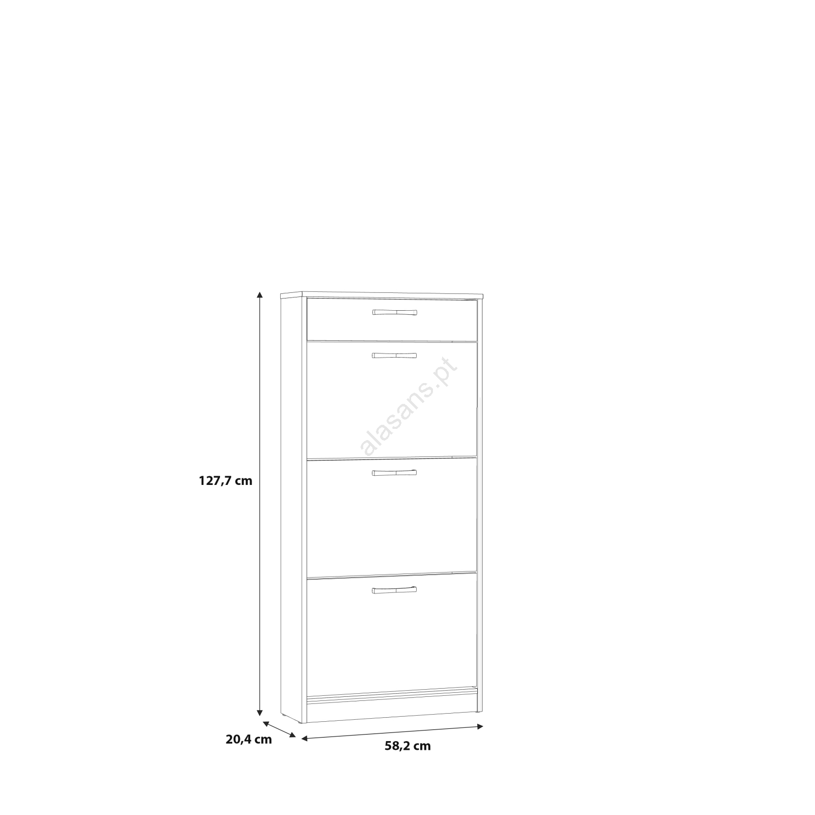 • Graças ao seu perfil esguio, esta sapateira de 4 níveis ocupa pouco espaço no chão, oferecendo ao mesmo tempo amplo espaço de arrumação.