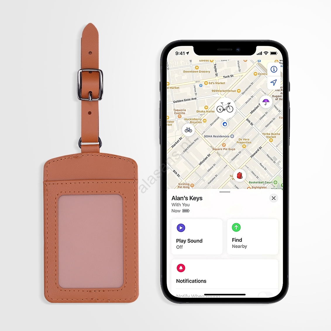 • Localizador Bluetooth elegante em formato de etiqueta de bagagem, a solução ideal para qualquer viajante.