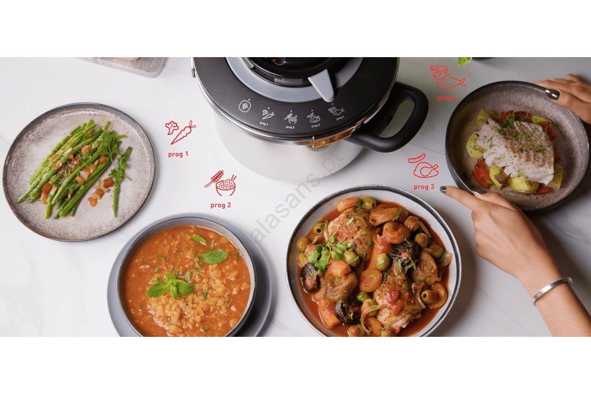 • A panela tem 4 programas pré-definidos (legumes, cereais/leguminosas, carne, peixe), que facilitam a preparação de diversos tipos de alimentos.