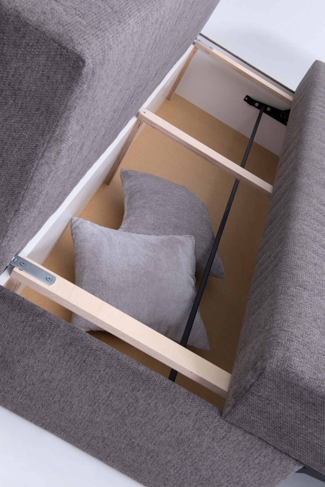 • O sofá possui um amplo espaço de arrumação, ideal para roupa de cama ou outros objetos.